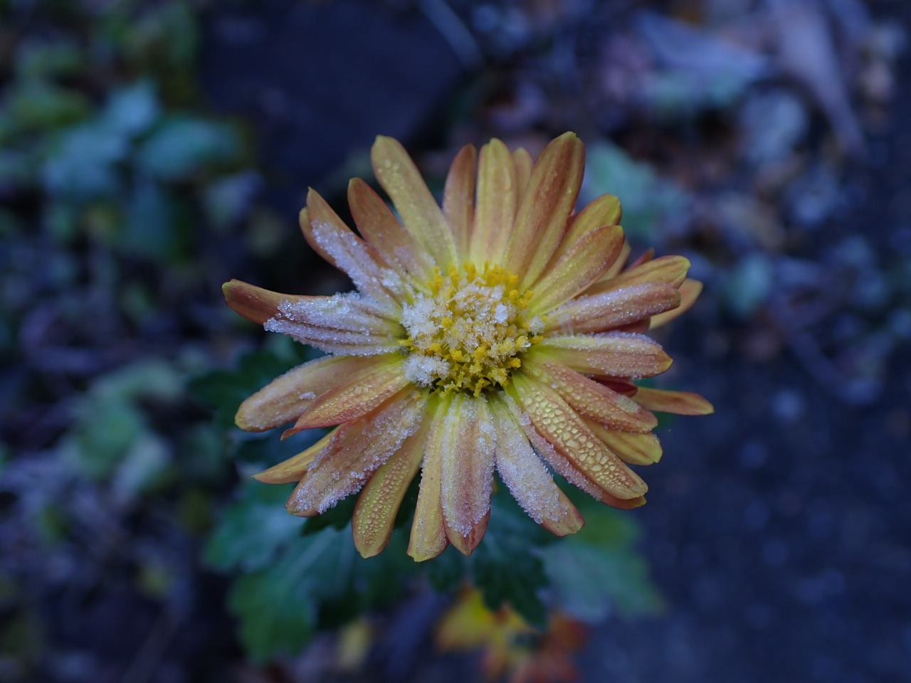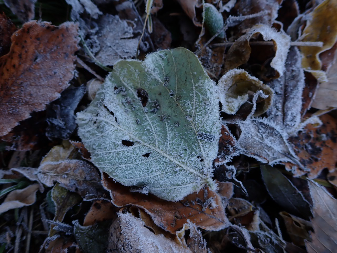 山に入る里山の日陰の道端では霜が降りて地面に落ちた落ち葉はもちろん、花までも真っ白です。