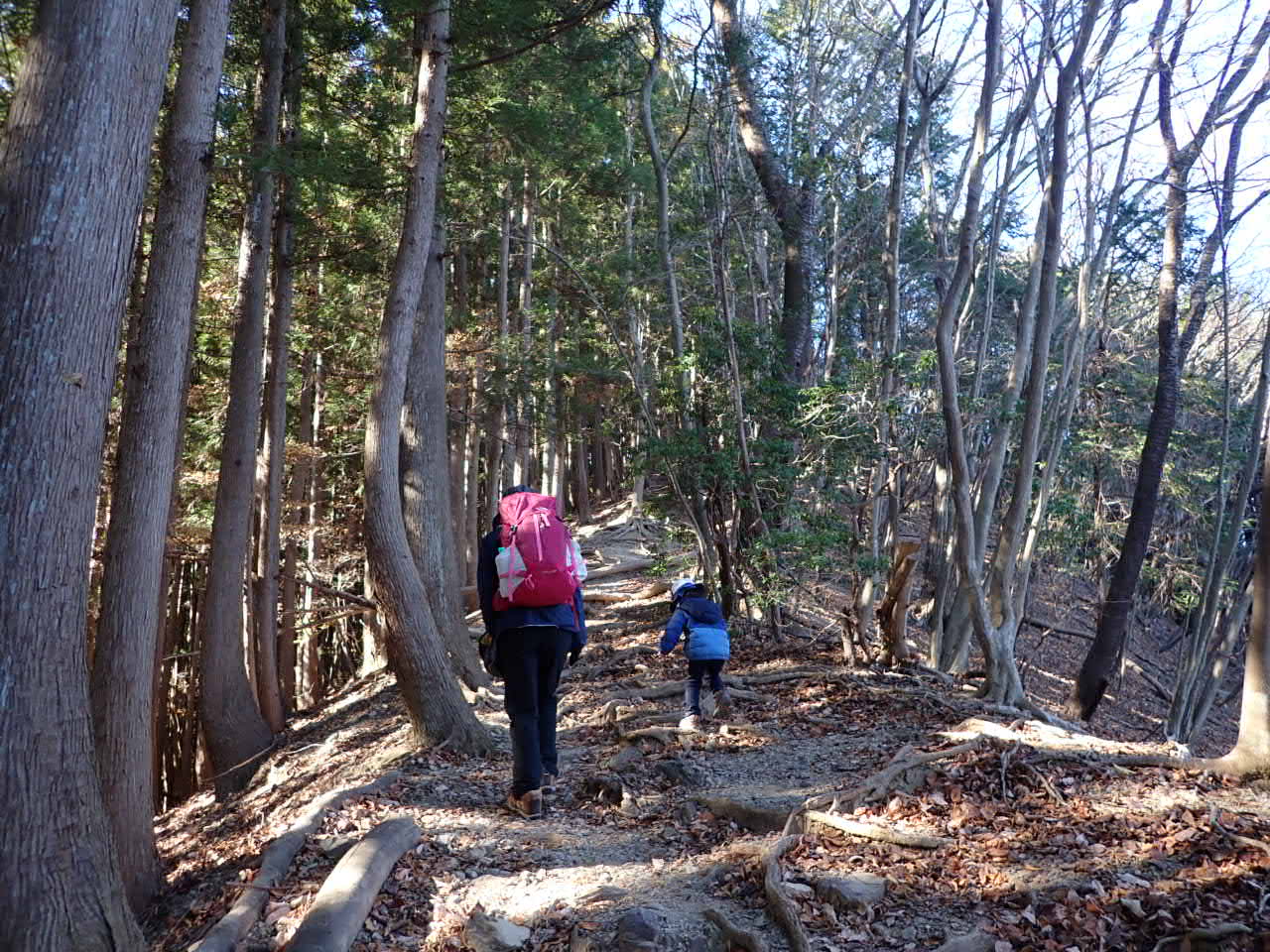 尾根道に出ると左手は人工林、右手は天然の落葉樹林となりました。日当たりの良い斜面を選んで植林されたのでしょう。
