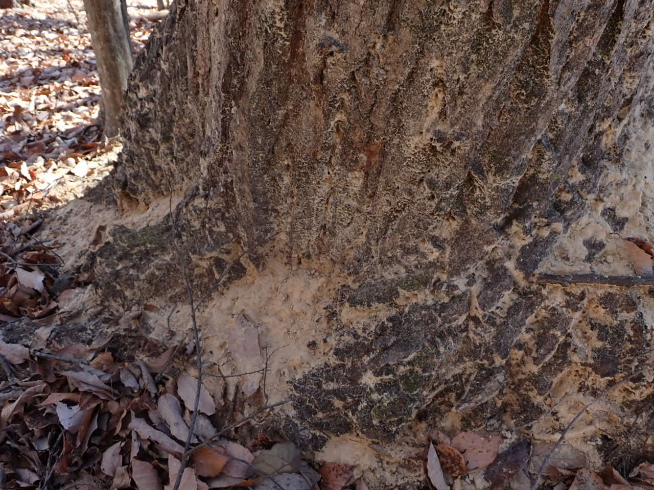 冬で落葉しているのでよくわかりませんが、根元に木のカスの蓄積で虫が入り込んでしまった樹木なのかどうか判別できます。こんなふうに感染してしまった樹木がたくさんあります。