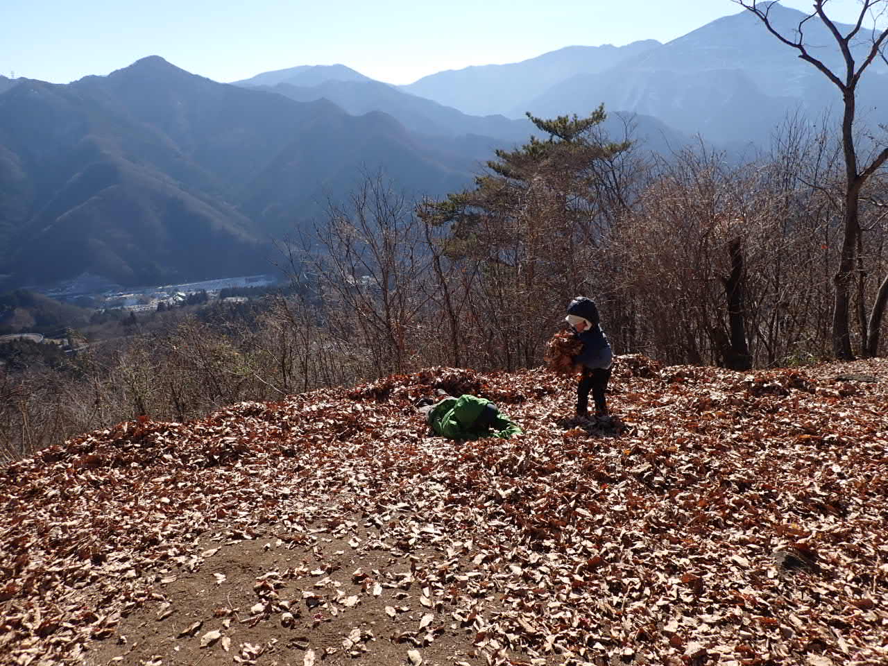 大量の落ち葉の吹き溜まりで遊ぶ。確かに落ち葉の中は日差しにも温められてぬくぬくです。こういう所なら女王ハチは春まで安らかに眠れるのでしょう。ニンゲンの子供に落ち葉をほじくり返されることがなければ。